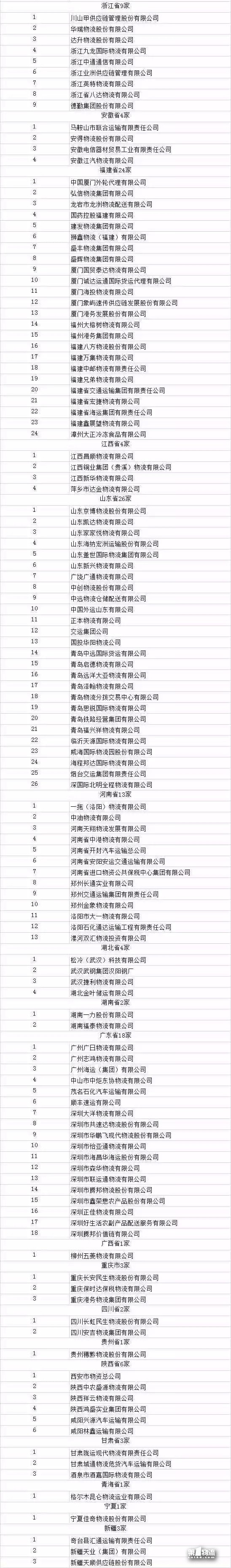 在全国先进物流企业中,央企8家,北京市有10家,天津市7家,河北省有19家,上海市有61家,江苏有35家,浙江省9家,福建省24家,山东省26家,河南省13家,广东省18家。
