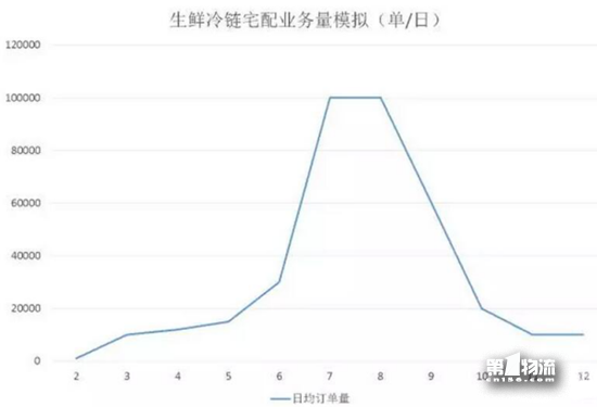 在每年的7月和8月份就是生鲜业务对冷链物流服务需求的最高峰,而9月、10月因为是“鲜收”的高峰,比如大闸蟹等。所以尽管这个时候,天气已经开始普遍转凉,但是生鲜的冷链需求还是有的。到了11月份天气转凉,各企业基于成本的考量,都纷纷把生鲜产品改用“普件”方式进行配送,因此生鲜的订单量急剧下滑。在低谷运行需要一直持续到次年5月份,只有到了6月份,随着天气开始变热业务量才会好转。当然,是不是高峰和低谷的差异就一定这么大,具体的数据各冷链宅配物流公司才有深刻的体会。