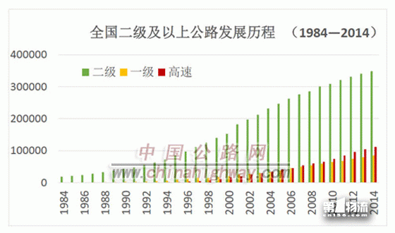 截至2014年底,全国公路总里程达到446.39万公里,是1984年底的4.8倍。其中,高速公路从无到有,达到11.19万公里,里程规模超越美国,居世界第一位;一级公路8.54万公里,是1984年底的260.3倍;二级公路34.84万公里,是1984年底的18.6倍。
