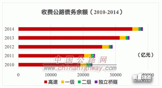 截至2014年底,全国收费公路债务余额为38451.4亿元。其中,政府还贷公路22261.6亿元,经营性公路16189.8亿元,分别占全国收费公路债务余额的57.9%和42.1%;高速公路35208.8亿元,一级公路1855.9亿元,二级公路688.5亿元,独立桥梁隧道698.2亿元,分别占全国收费公路债务余额的91.6%、4.8%、1.8%和1.8%。