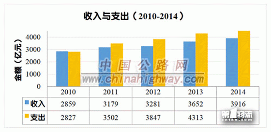 2014年全国收费公路收支对比结果为-1571.1亿元。与2011年至2013年(收支对比结果依次为:-323亿元、-566亿元和-661亿元)相比,收支缺口进一步扩大。