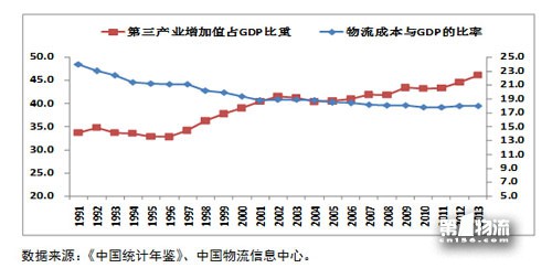 由此预计,按照第三产业增加值占GDP的比重每上升1个百分点,社会物流总费用与GDP的比率下降0.5个百分点计算,到2020年,我国社会物流总费用与GDP的比率将下降至14.5%左右。