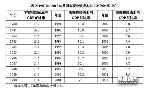 宏观物流成本核算起源于美国,最早可以追溯到上个世纪60年代初。1962年,美国哈佛大学Hes-kett J.L.教授提出了较系统地宏观物流成本(Macroeconomic logistics costs)核算方法,并逐渐成为美国、日本、韩国、南非等世界各国通用的方法,我国的物流统计核算也采用此方法。宏观物流成本具体包括运输成本、存货持有成本、物流管理成本。1973年,美国Cass信息系统公司开始计算美国的宏观物流成本,现在每年将研究成果发布在《美国物流年度报告》上。1980年,美国宏观物流成本与GDP的比率为17.2%,位于较高水平,如表2所示。