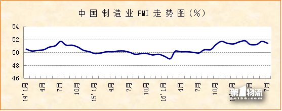 中国物流与采购联合会、国家统计局服务业调查中心发布的2017年7月份中国制造业采购经理指数(PMI)为51.4%,较上月回落0.3个百分点。但总体来看,指数回落幅度较小,连续10个月保持在51%以上,处在近年来的相对较高水平。