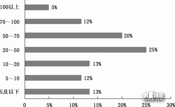 物流园区公共信息平台投入占园区实际投资的比例平均为7.9%,而园区软件系统投入占公共信息平台投入的比例平均为54.6%。物流园区公共信息平台投入规模分布情况如图13所示。