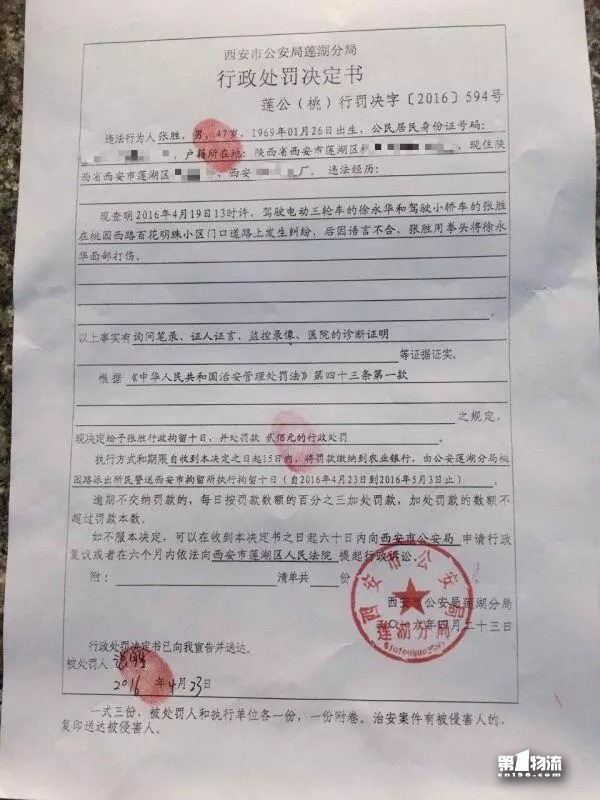 快递员徐永华的私家车驾驶人张某迫于警方压力,于23日上午11时主动到桃园路派出所接受调查。根据《治安管理处罚法》的相关规定,莲湖警方依法给予张某行政拘留10日,并处罚款200元的行政处罚。