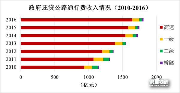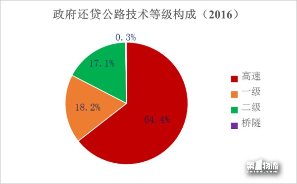 截至2016年底,政府还贷公路债务余额26107.5亿元,占全国收费公路债务余额的53.8%。其中,政府还贷高速公路债务余额24248.7亿元,一级公路1264.6 亿元,二级公路394.9 亿元,独立桥梁隧道199.3亿元,分别占年末债务余额的92.9%、4.8%、1.5%和0.8%。