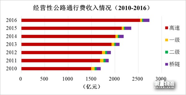 2016年度,全国收费公路通行费总收入为4548.5亿元。其中,高速公路4181.3 亿元,一级公路143.7 亿元,二级公路59.3亿元,独立桥隧164.1亿元,分别占全国收费公路通行费总收入的91.9%、3.2%、1.3%和3.6%。