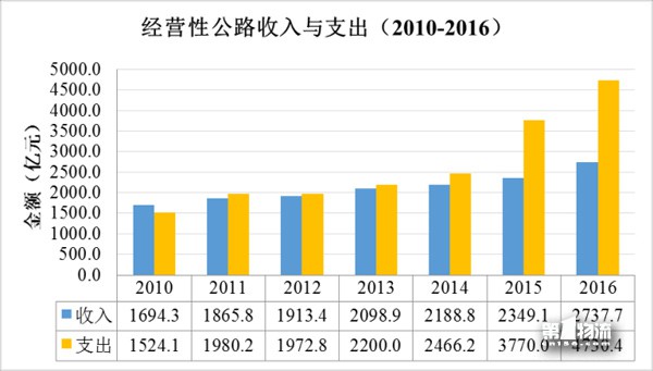 2016年全国收费公路收支缺口4143.3亿元。与2010年至2015年相比,收支缺口进一步扩大,但增速有所减缓。