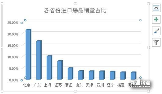 进口爆品销往省份:进口爆品销往中国大陆31个省份和地区,其中北上广、江浙、山东、天津、四川、辽宁、福建、河北购买的商品件数最多。