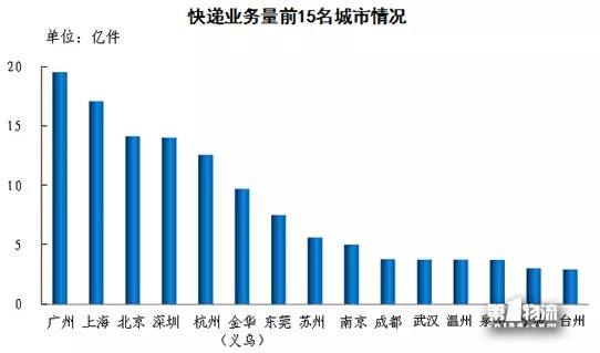 快递业务量排名前十五位的城市依次是广州、上海、北京、深圳、杭州、金华(义乌)、东莞、苏州、南京、成都、武汉、温州、泉州、宁波和台州,其快递业务量合计占全部快递业务量的比重达到61.1%。