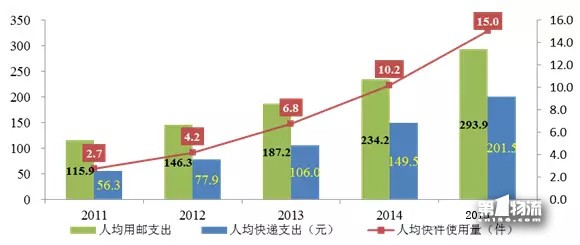 2011-2015年人均用邮支出、快递使用量和快递支出情况