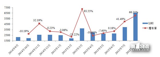 2014年9月至2015年8月的LHI指数如图1所示,2015年8月LHI指数最大,达到6587,较上月增长66.21%。2015年3月LHI指数增长幅度最大,达到93.55%。