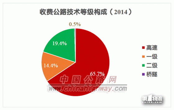 按照收费公路技术等级划分,高速公路10.67万公里,一级公路2.34万公里,二级公路3.16万公里,独立桥梁隧道0.08万公里,分别占收费公路总里程的65.7%、14.4%、19.5%和0.5%。