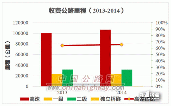 与2013年相比,全国收费公路总里程由15.65万公里增加到16.26万公里,净增0.61万公里,增长3.9%。其中,高速公路里程由10.04万公里增加到10.67万公里,净增0.63万公里,增长6.3%;一级公路里程由2.35万公里减少到2.34万公里,净减0.01万公里,下降0.04%;二级公路里程由3.18万公里减少到3.16万公里,净减0.02万公里,下降0.6%;独立桥梁隧道里程基本保持不变,仍为0.08万公里。随着高速公路里程不断增长和普通收费公路逐步有序取消收费,全国收费公路结构进一步优化。