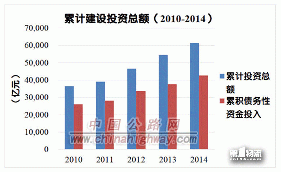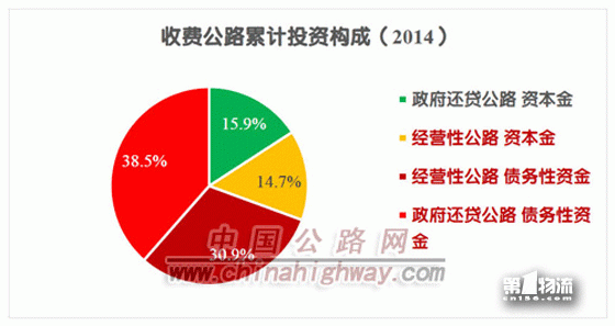 截至2014年底,全国收费公路累计建设投资总额为61449.0亿元。其中,政府还贷公路33412.2亿元,经营性公路28036.7亿元,分别占累计建设投资总额的54.4%和45.6%;高速公路55410.7亿元,一级公路3407.1亿元,二级公路1297.6亿元,独立桥梁隧道1333.6亿元,分别占累计投资总额的90.2%、5.5%、2.1%和2.2%。