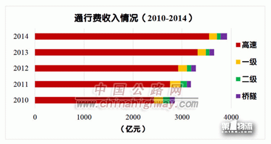 2014年度,全国收费公路车辆通行费总收入为3916.0亿元。其中,高速公路3549.4亿元,一级公路160.7亿元,二级公路76.3亿元,独立桥梁隧道129.5亿元,分别占全国车辆通行费总收入的90.6%、4.1%、1.9%和3.3%。