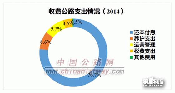 与2013年相比,收费公路支出中,还本付息支出比例由73.0%增长到76.7%。还本付息支出中,偿还债务利息的比例由54.2%下降为49.9%,偿还债务本金的比例由45.8%上升为50.1%。