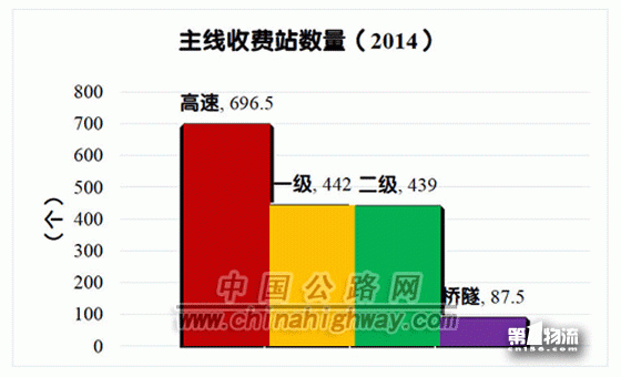 收费公路共设主线收费站1665个。其中,高速公路696.5个(省界联合设置的收费站,每省按照0.5个计算,下同),一级公路442个,二级公路439个,独立桥梁隧道87.5个,分别占公路主线收费站总数的41.8%、26.5%、26.4%和5.3%。