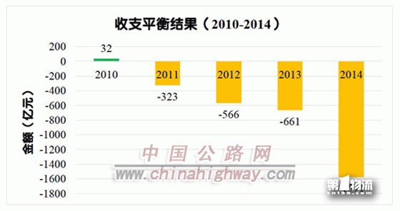 2014年全国收费公路收支对比结果为-1571.1亿元。与2011年至2013年(收支对比结果依次为:-323亿元、-566亿元和-661亿元)相比,收支缺口进一步扩大。