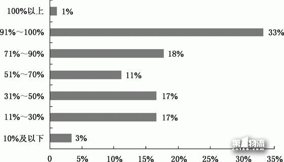 根据统计结果,目前我国物流园区的物流运营面积占比平均为75%,大于《规范》中50%的下限值。尽管物流运营面积占比总体情况较好,但仍有16%的园区物流运营面积占比小于50%。